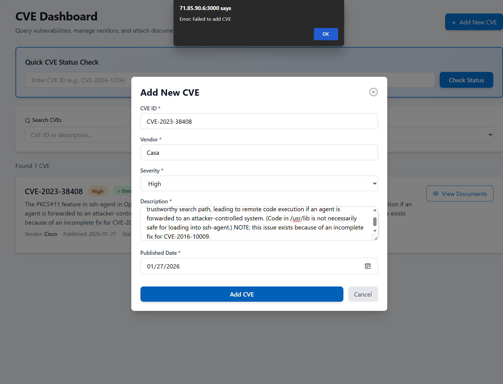 UNIQUEconstraint oncve_idalone, preventing multiple vendors from being added to the same CVE-ID.Fix Applied