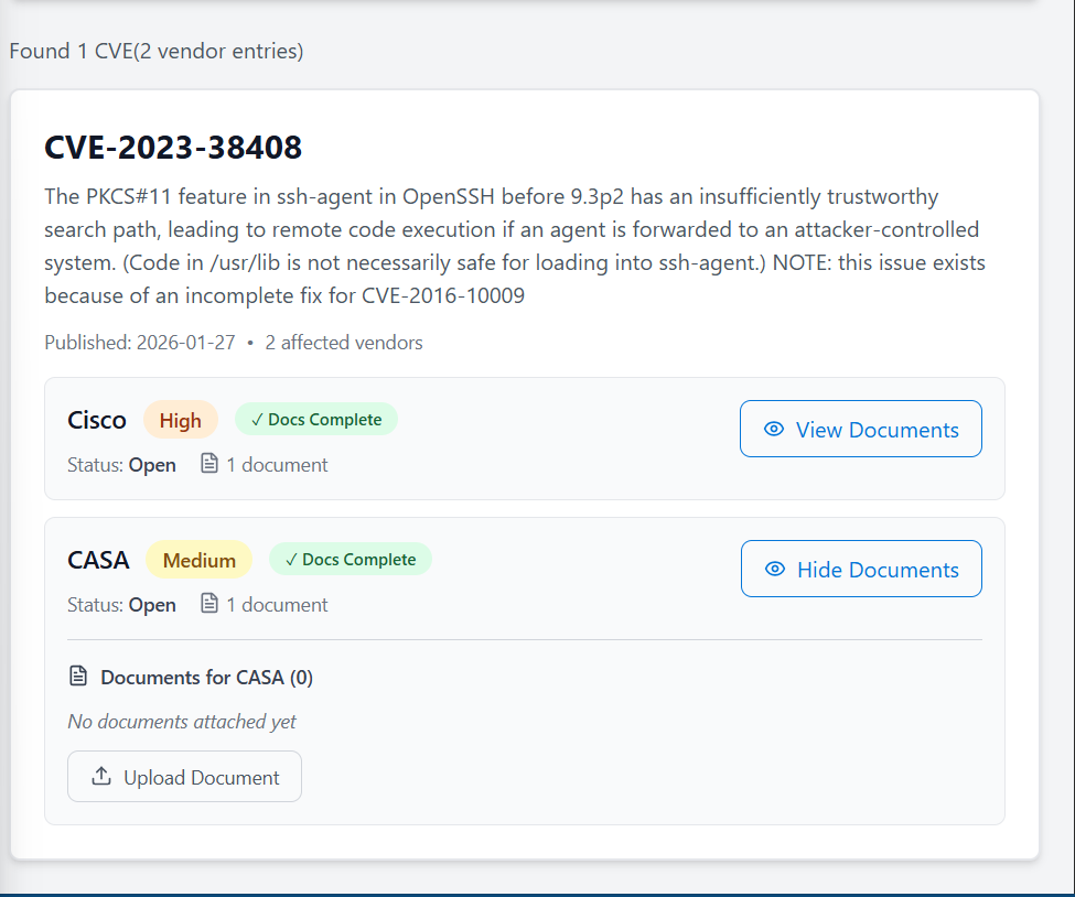 Issue Resolution Root Cause: The database schema had a UNIQUE constraint on cve_id alone, preventing multiple vendors from being added to the same CVE-ID. Fix Applied: